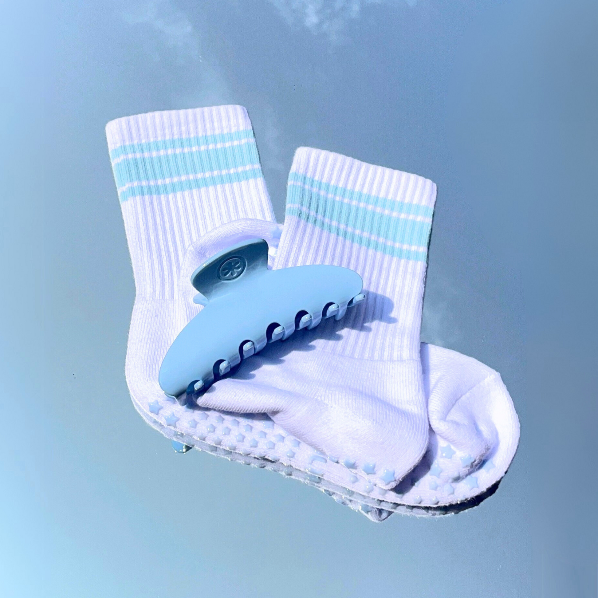 Our Grips + Clips Set pairs a 13” (USA or Dolly) or 17” (City) studio sock with a coordinating claw clip — the perfect duo for Pilates flows, on-the-go days, and everything in between.