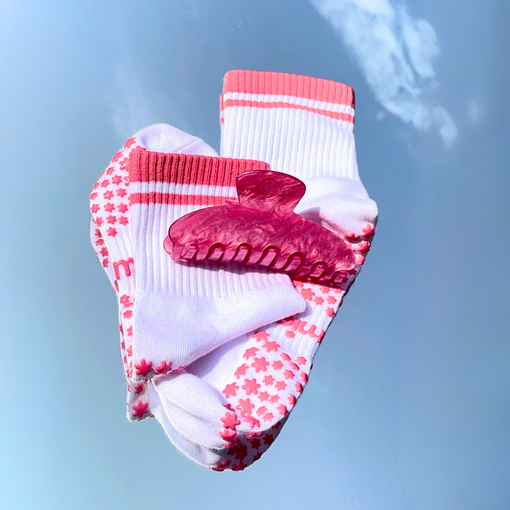 Our Grips + Clips Set pairs a 13” (USA or Dolly) or 17” (City) studio sock with a coordinating claw clip — the perfect duo for Pilates flows, on-the-go days, and everything in between.